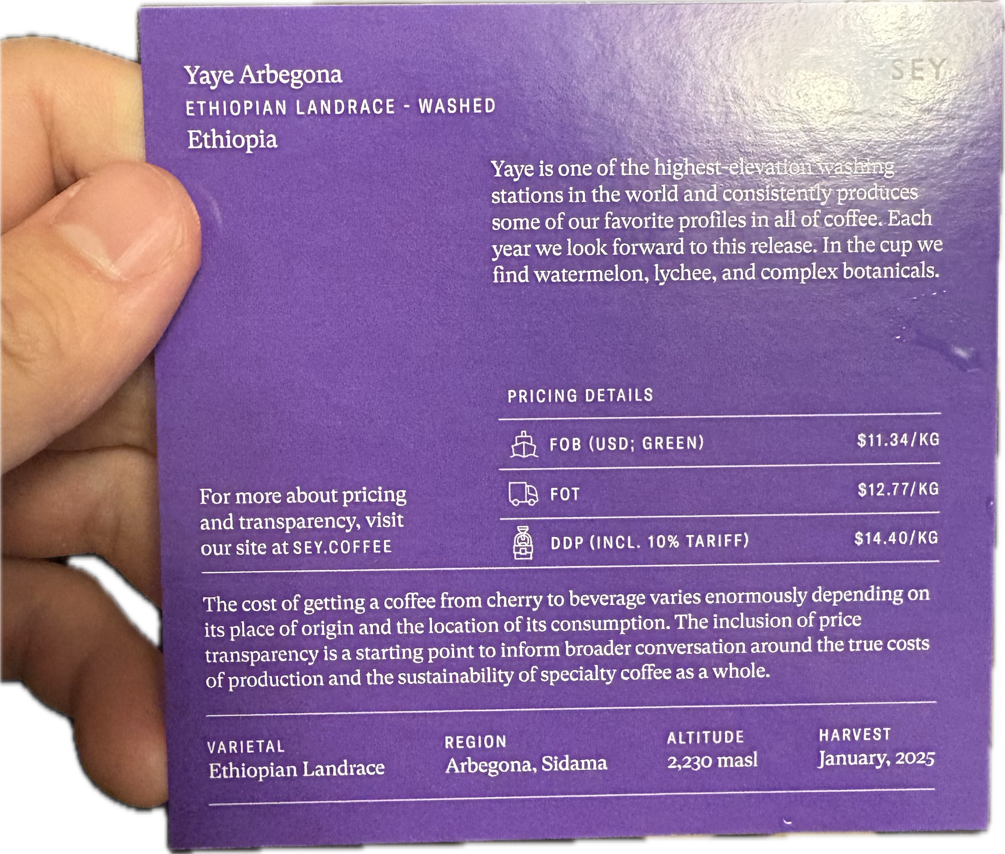 The cost of getting a coffee from cherry to beverage varies enormously depending on its place of origin and the location of its consumption. The inclusion of price transparency is a starting point to inform broader conversation around the true costs of production and the sustainability of specialty coffee as a whole.